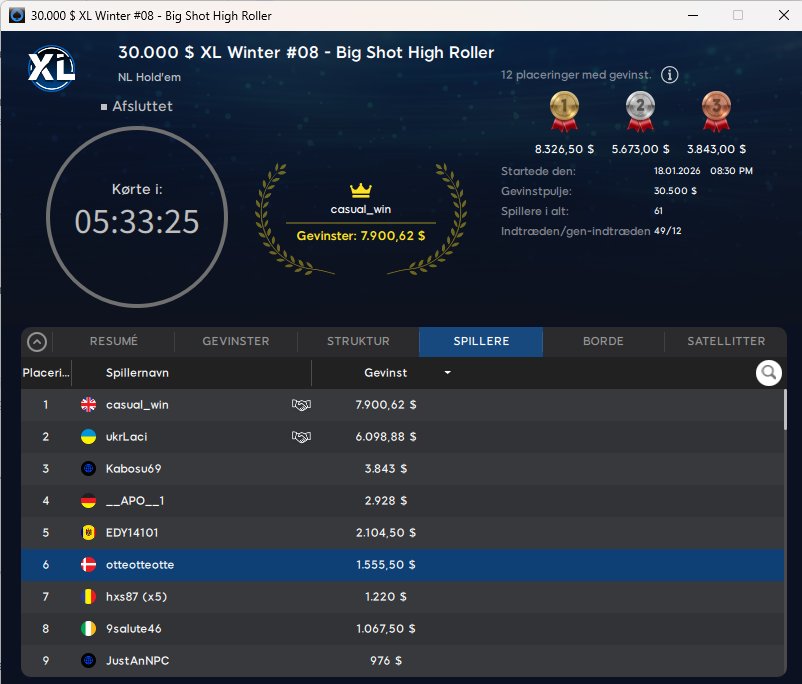 Det gik en del bedre økonomisk for otteotteotte i $525 XL Winter #08: Big Shot Highroller med $30.000 garanteret. Her blev danskeren nr. 6 til $1.556.