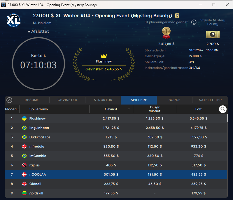 Vi fandt også en mindre gevinst i $55 XL Winter #04: Opening Event Mystery Bount med $27.000 garanteret. Her var det n000tAA der blev nr. 7 til samlet $483.