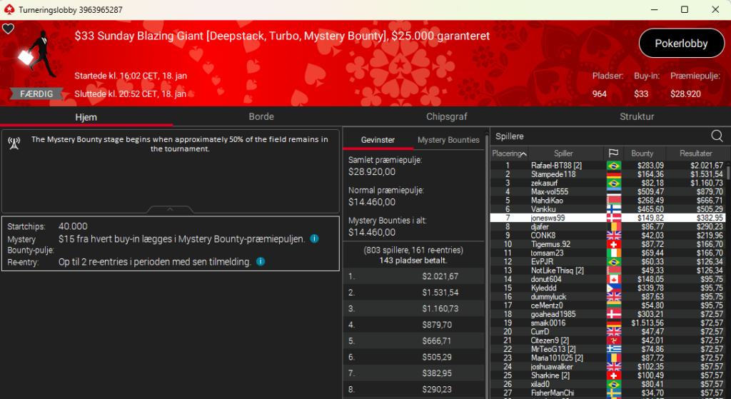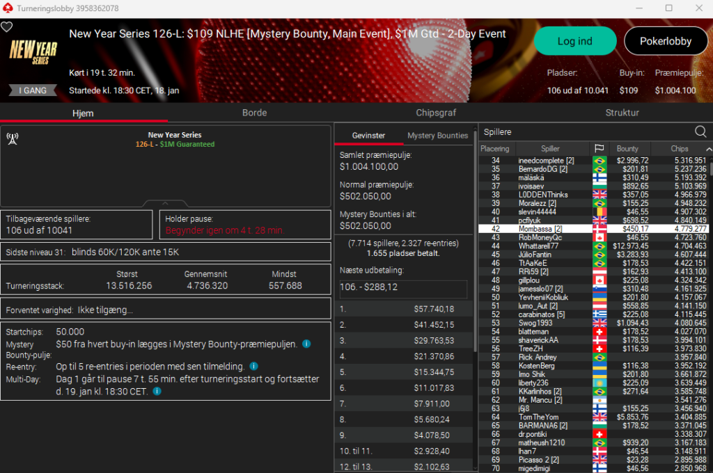 I $109 Sunday Million, der i går hed: New Year Series: $109 NLH Mystery Bounty Main Event med $1 million garanteret var der 10.041 entries, så altså intet overlay. Der er 106 spillere tilbage og seks danskere.