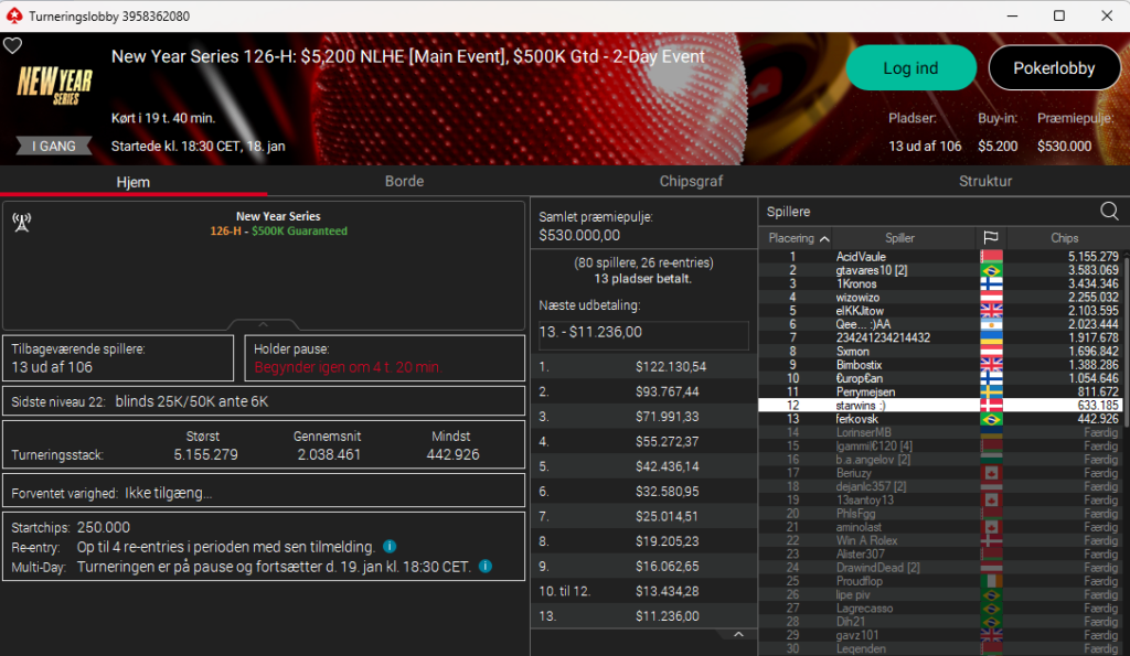 I New Year Series: $1.050 NLH PKO Main Event med $500.000 garanteret er Frederik “Troll4You” Dvinge videre til dag 2 og ligger fint til som nr. 16 ud af 79 spillere. Fint skud til Troll4You, der bliver spændende at følge.