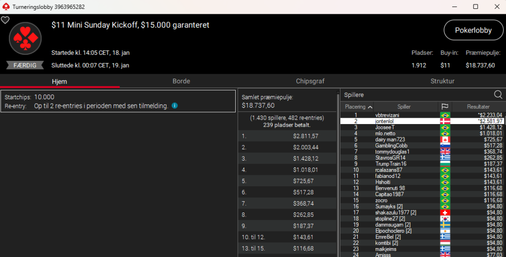 I går var det jontenlol (der i øvrigt hedder det samme på Pokernet), der i $11 Mini Sunday Kickoff med $15.000 garanteret blev nr. 2 og vandt $2.582 efter en heads-up deal. Stort tillykke herfra.