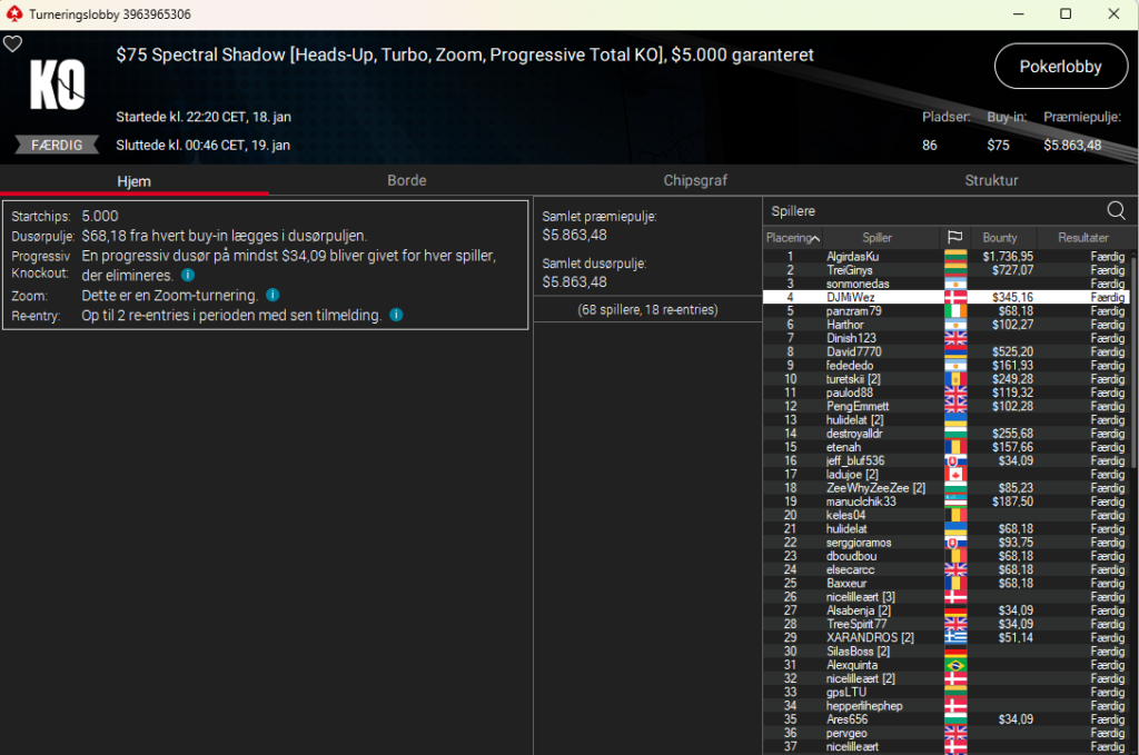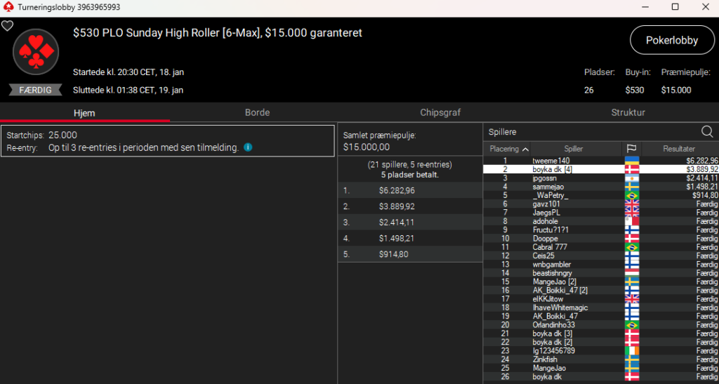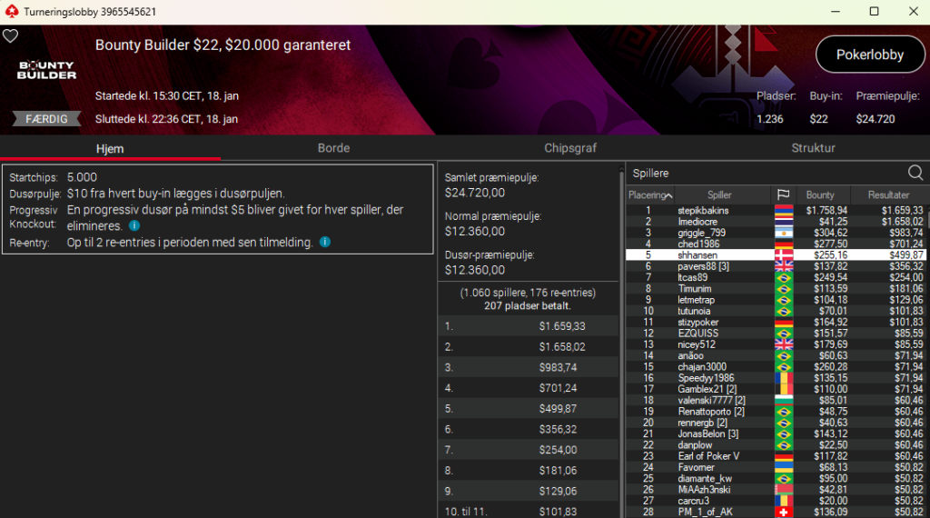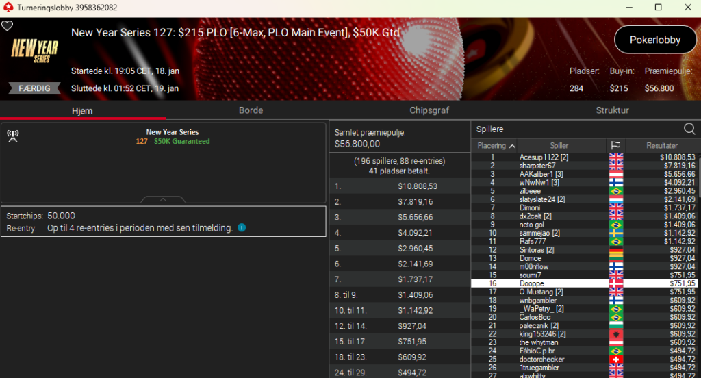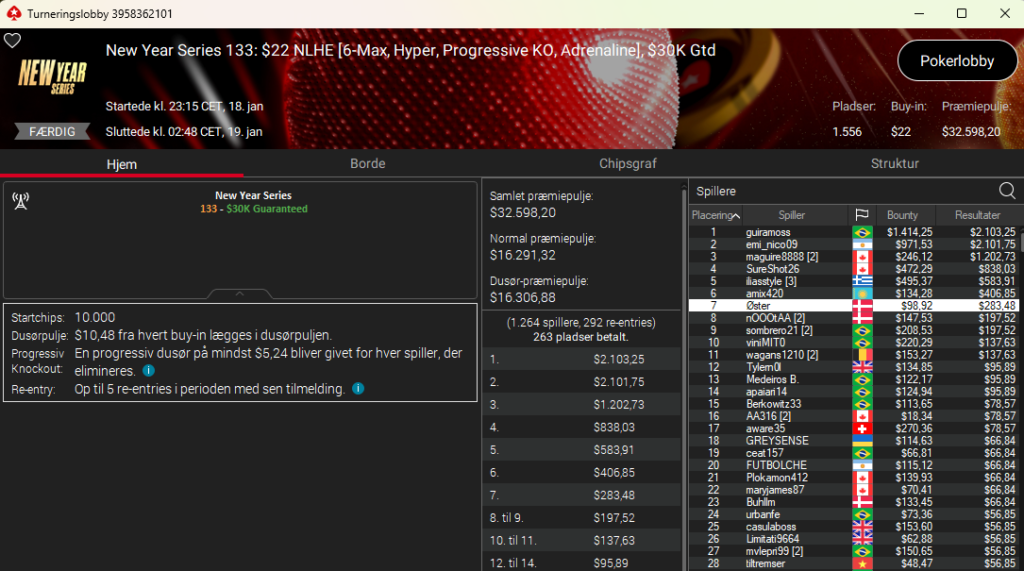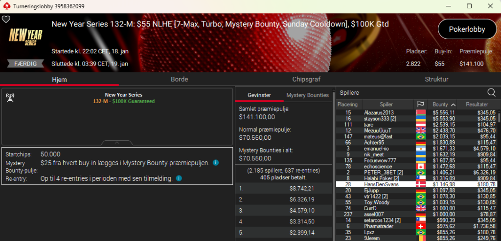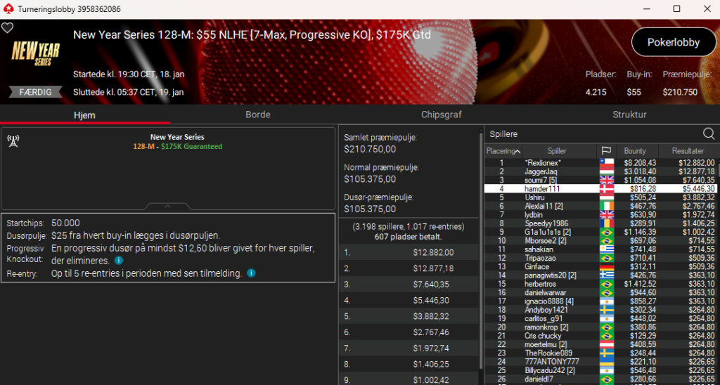 4.214 entries og en dansker på en flot 4. plads. Det var hamder111 med samlet præmie på hele $6.263. Imponerende flot. Det var i New Year Series: $55 NLH 7-Max PKO med $175.000 garanteret.