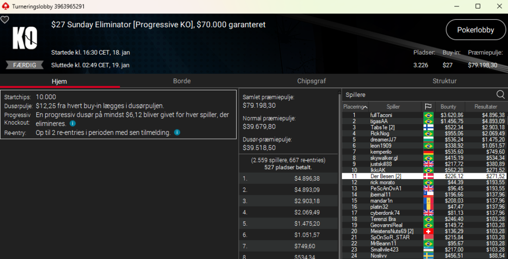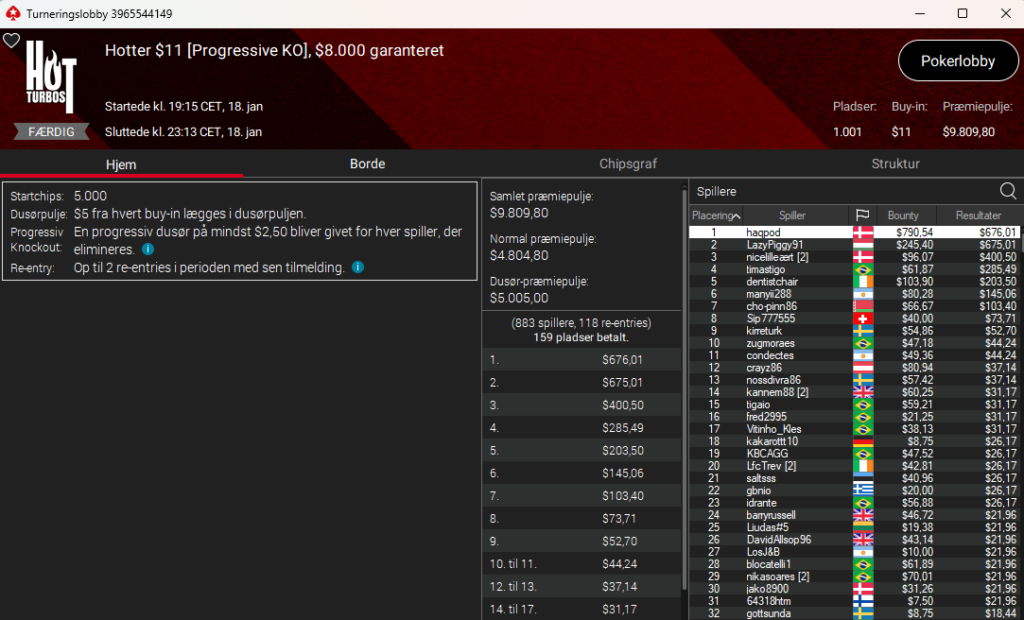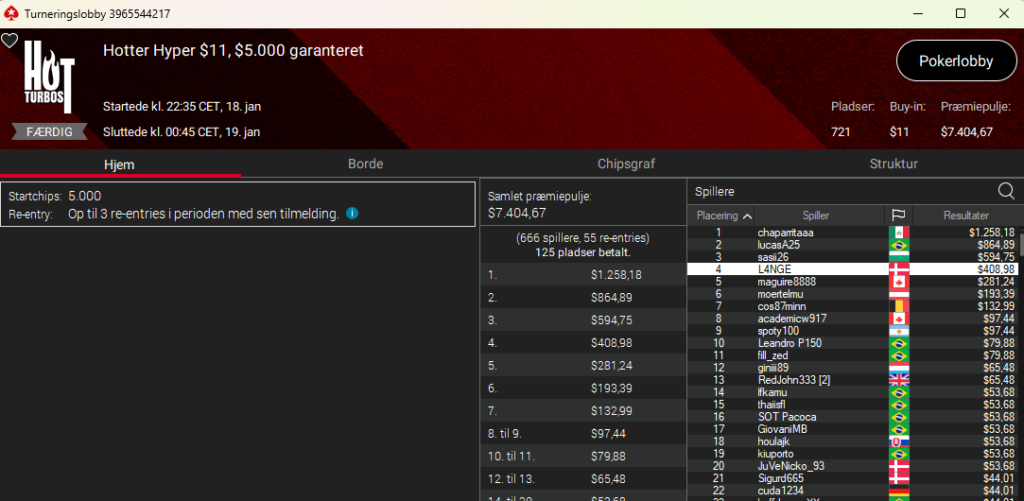 Der var også dansk sejr i Hotter $11 PKO med $8.000 garanteret. Her var det haqpod med sejren og samlet $1.467. Der var også dansk på tredjepladsen i nicelilleært, der samlet vinder $497.
