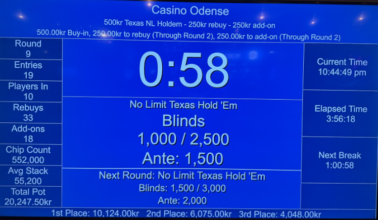 Der blev spillet friskt til fra starten. De 19 spillere lavede i alt 33 rebuys, og da rebuyperioden var slut, valgte næsten alle at tage add-on – kun én spiller stod over. Dermed endte præmiepuljen på 20.247 kr. og penge til top-3.