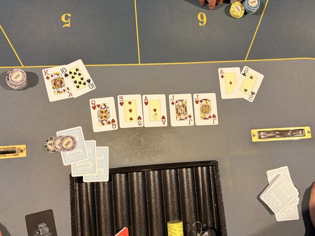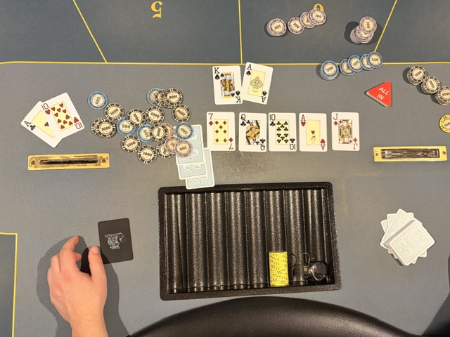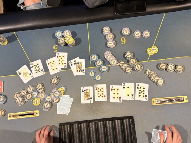 Lige inden finalebordet blev fundet var en shortstack all-in med big slick (AK) og godt inde mod AT. Trods en 10’er på floppet, så lykkedes det at ramme en straight på river og spilleren dobler.