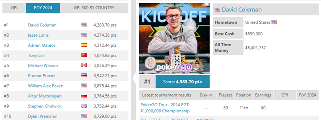 Den samlet bedste spiller i hele verden sidste år var amerikanske David Colman, der cashede i hele 48 tællende turneringer og havde hele 6 store titler. David vandt tællende præmier for imponerende $5.222.876 i 2024 alene. Her et skærmbillede af top 10: