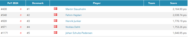 Som man kan se på listen. Så finder vi Martin Stausholm øverst. Selvom vi er glade på Martins vegne over den flotte 1. plads, så må vi også bøje os i støvet og indrømme at 2024, med internationale briller, ikke var Danmarks bedste poker år i live-poker. Johan Schultz-Pedersen vandt godt nok et WSOP-bracelet og vi havde nogle okay resultater rundt omkring. Men når vores bedste spiller blot slutter som nr. 438 på ranglisten, så er der lang vej endnu.