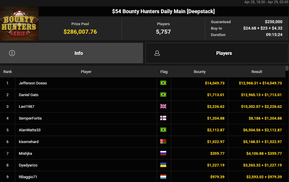 I $54 Bounty Hunters Daily Main Deepstack med $250.000 garanteret blev SemperFortis nr. 4 og vinder samlet $9.391.