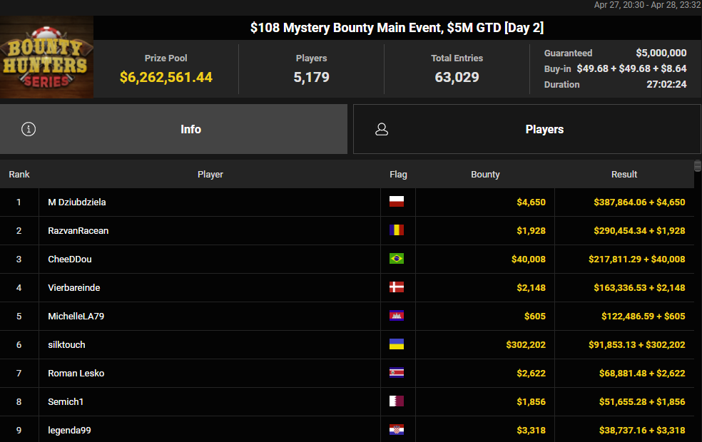 Det var en vildt spændende finaledag i $108 Mystery Bounty Main Event med $5 millioner garanteret. 63.029 entries og blot ni tilbage på finalebordet. Alle sikret $38.737 og dansk chipleader i Vierbareinde.
