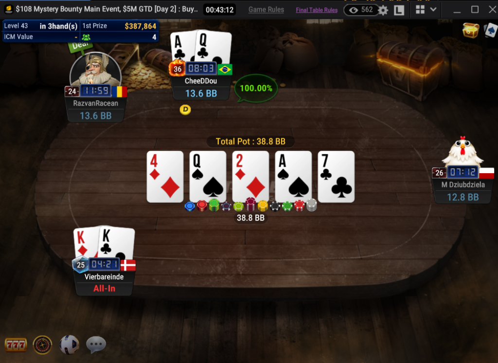 I den afgørende hånd med fire spillere tilbage 3-better Vierbareinde med kongerne fra big blind – kald af CheeDDou fra Brasilien med AQ. Dame på floppet og de kommer naturligvis all-in. Turn er et klamt es og Vierbareinde bliver nr. 4 til samlet $165.485. Stadigvæk et imponerende resultat og en flot præstation.