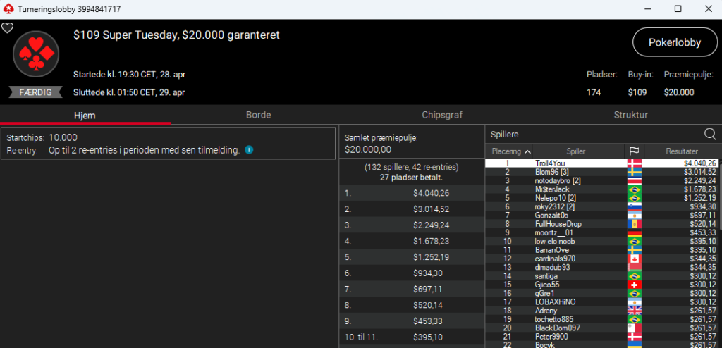 Det var en stille og rolig tirsdag på Stars. Frederik “Troll4You” Dvinge sikrede en flot titel i det han vandt den traditionelle $109 Super Tuesday med $20.000 garanteret. Sejren gav Frederik lidt at skyde med til Nordic Open i næste uge. Præmien lød på $4.040. Tillykke.