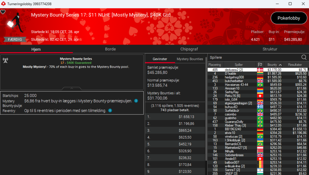 Jo, når man trækker den største Mystery Bounty der findes i turneringen – specielt når man kun har én enkelt Mystery Bounty. Den højeste Mystery Bounty var på $3.170. Den nappede dedusea2 altså og vinder samlet $3.179. Godt trukket!