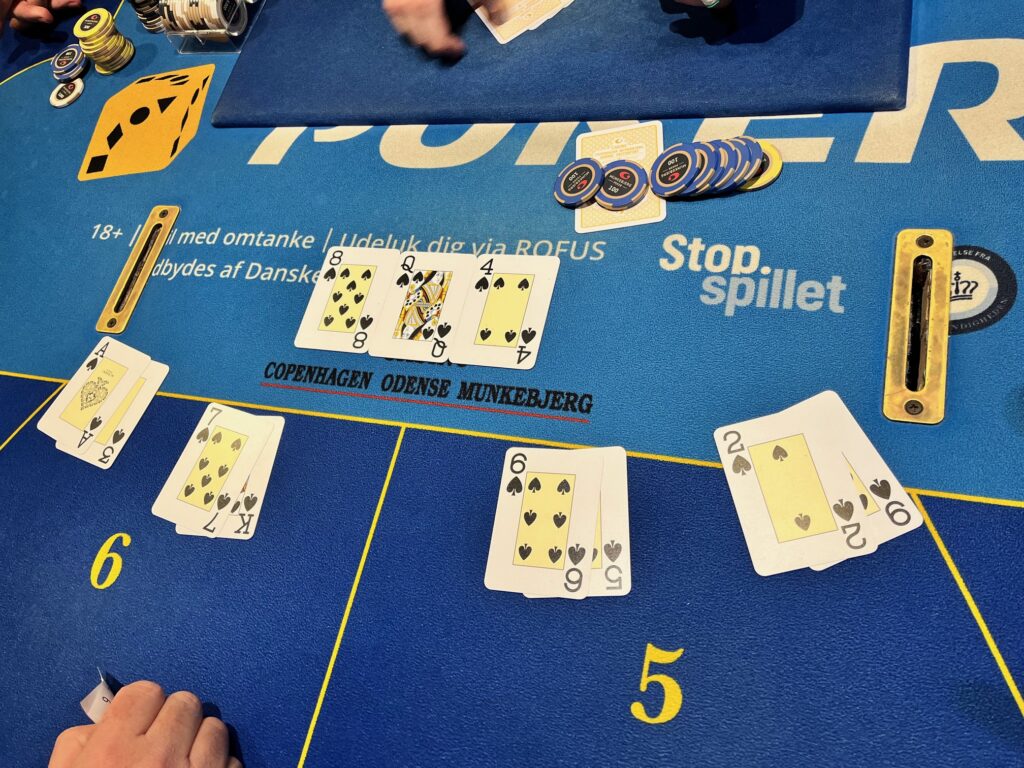 Vi starter lige med denne her – ja, du behøver ikke justere din briller. Der er FIRE spillere, som alle har floppet en flush samtidigt – det var altså 4-vejs all-in på floppet, som Freddy Madsen vinder med es høj flush: