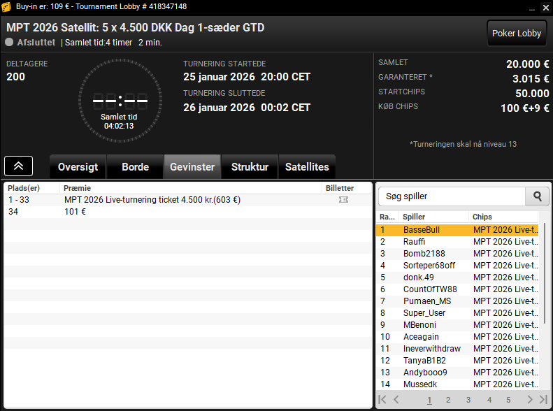 Næste søndag, den 1. februar 2026, er næstsidste online kval til MPT. Så mangler du en billet, så skynd dig at få spillet en af de to sidste kvaller. Husk, at du kan spille billige satellitter ind til kvalifikationssatellitten – helt ned til €5,50. Læs mere her.
