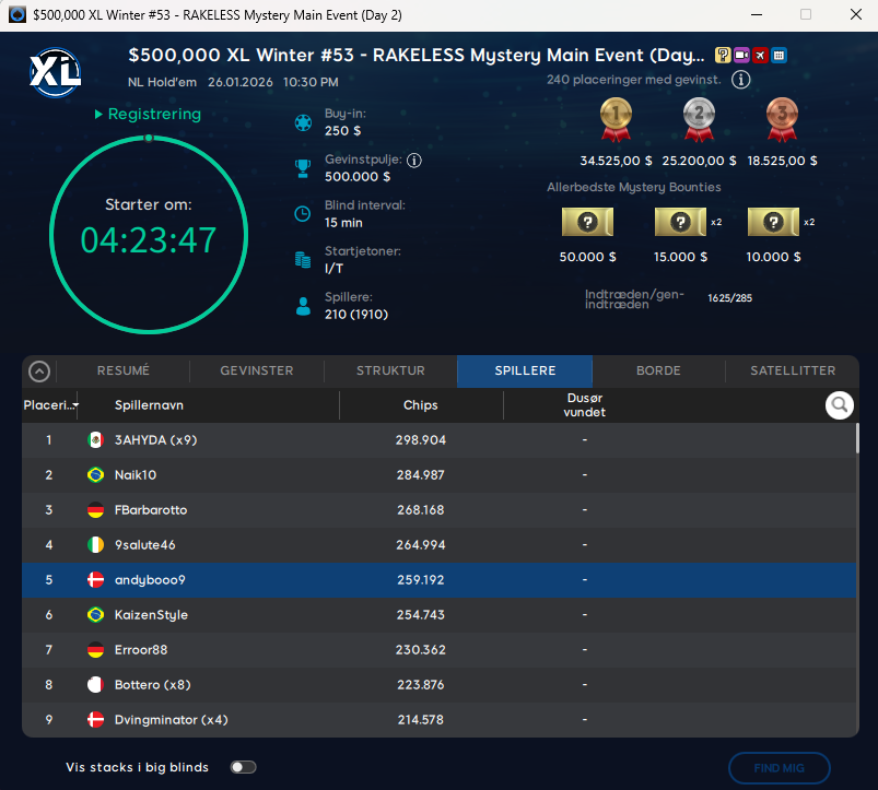 Der spilles stadigvæk XL Winter Series på 888poker og den store Mystery Bounty Main Event med $500.000 er i aften. Der er stadigvæk phase 1 kvaller til denne. Men selvfølgelig sidste chance i dag.