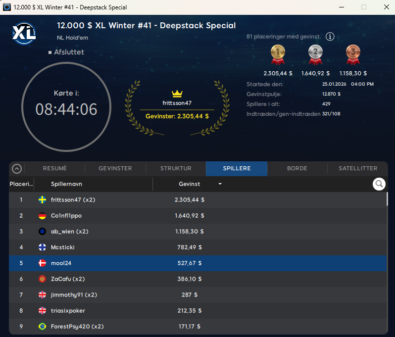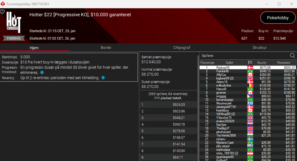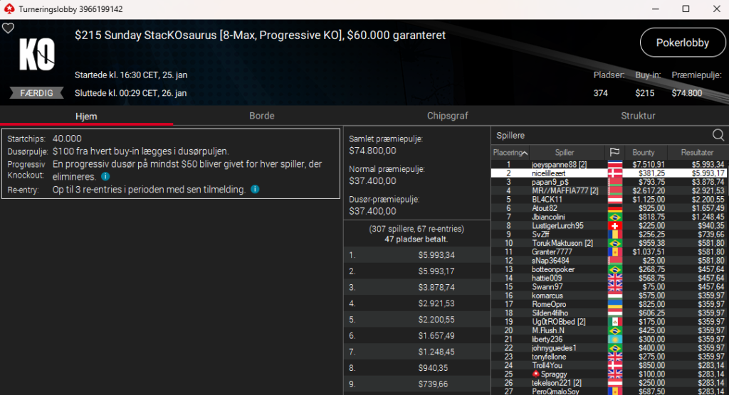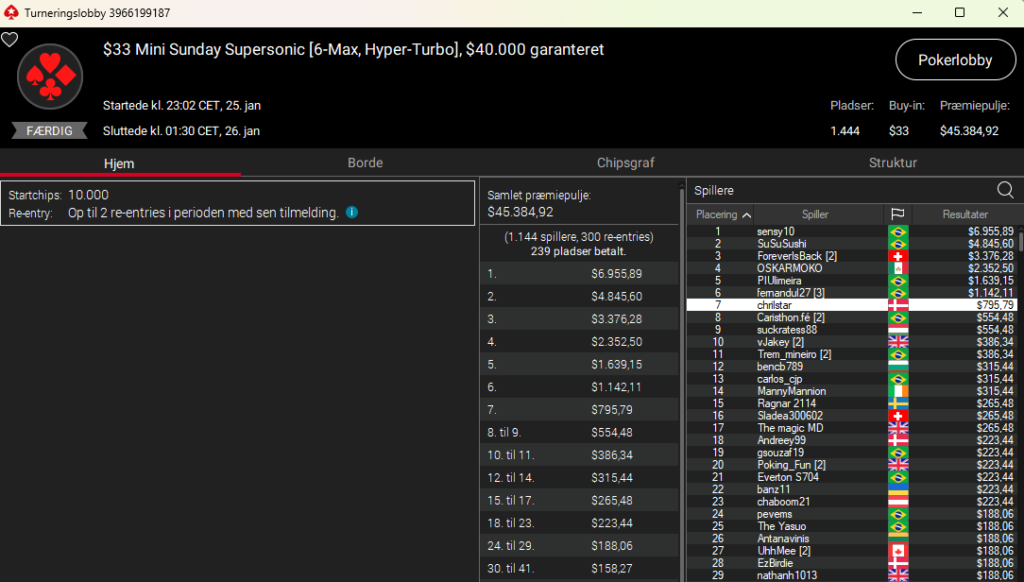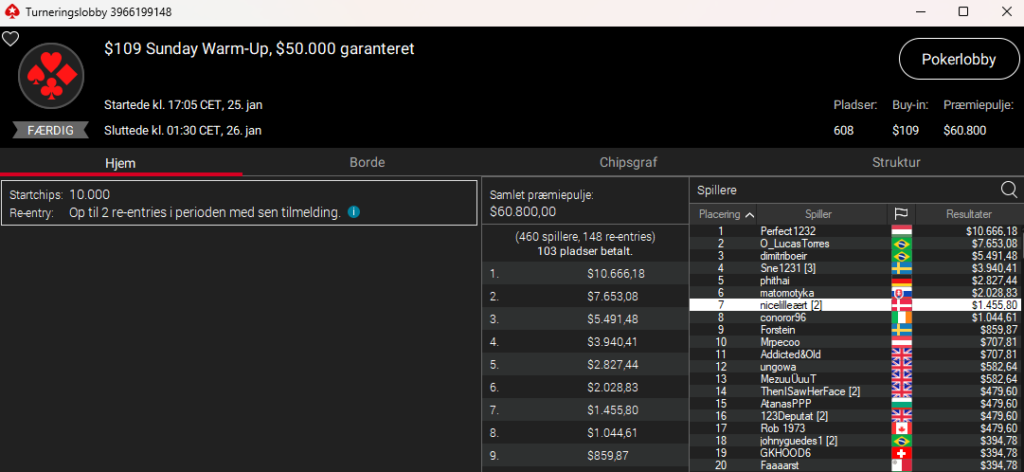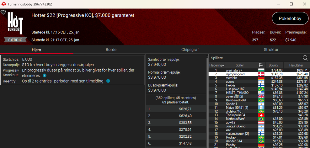 Der var en person ved navn Pokerjern, der vandt en turnering på Danske Spil Poker til $5.889. Det var i $215 The Big Sunday. Vi var tæt på at tage den med – men kan jo desværre ikke se flag/nationaliteter i den nuværende software (det bliver bedre på den nye GGPoker-klient), så endte med at lade være. Men er det en dansker, så tillykke herfra.