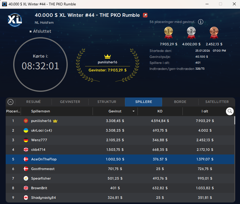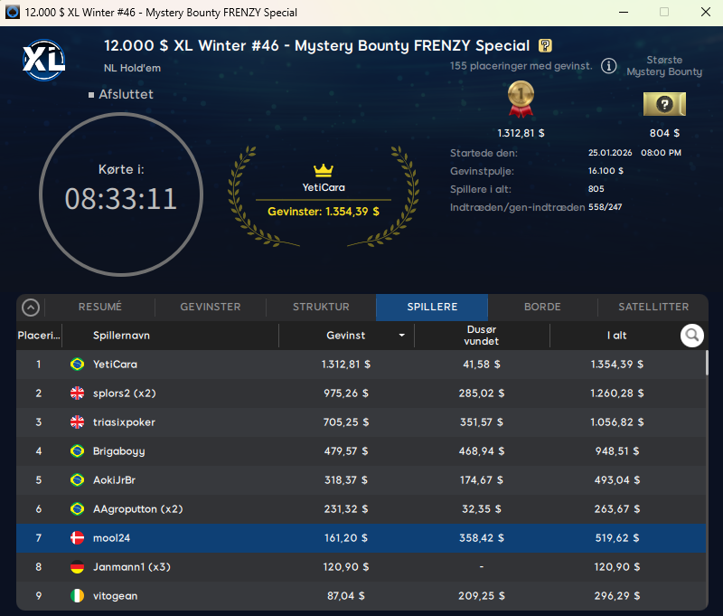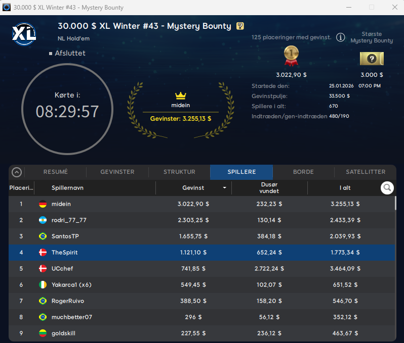 Der var ellers et par flotte resultater på 888poker søndag. Blandt disse var to danskere på finalebordet i $55 XL Winter: Mystery Bounty med $30.000 garanteret. Det var TheSpirit der blev nr. 4 og vandt samlet $1.773, mens UCchef trak bedre bounties og vandt samlet $3.464 på en 5. plads.