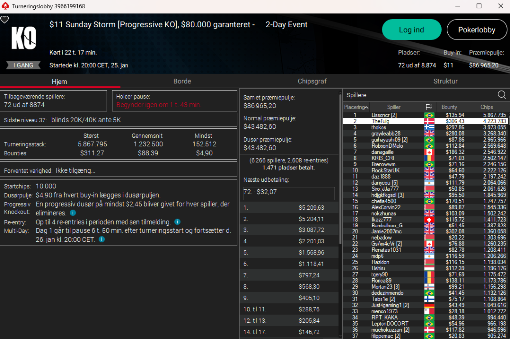 Der var ingen danskere videre i Mini Sunday Million, men i $11 Sunday Sorm PKO med $80.000 garanteret ligger TheFulg nr. 2 ud af 72 resterende spillere. “There is another….” dansk håb i muchokuzzan, som ligger nr. 36.