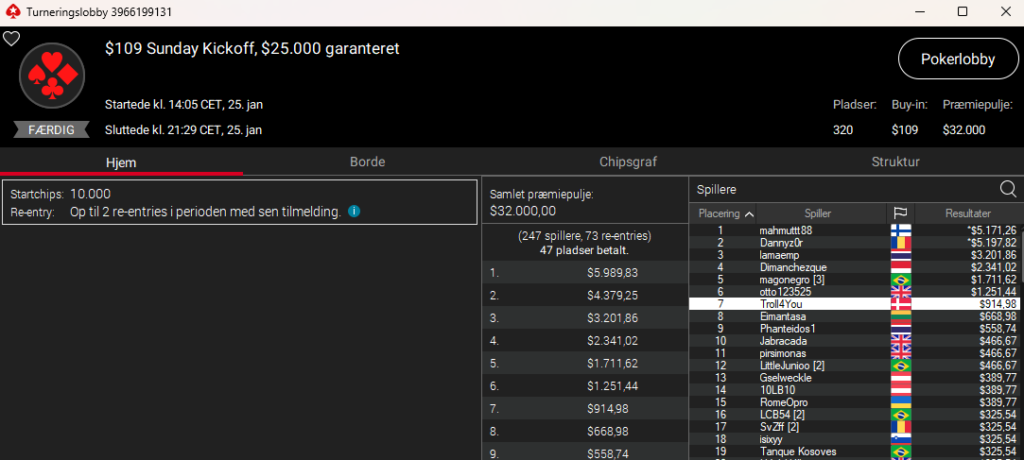 Frederik “Troll4You” Dvinge blev nr. 7 i $109 Sunday Kickoff med $25.000 garanteret og vandt $915.