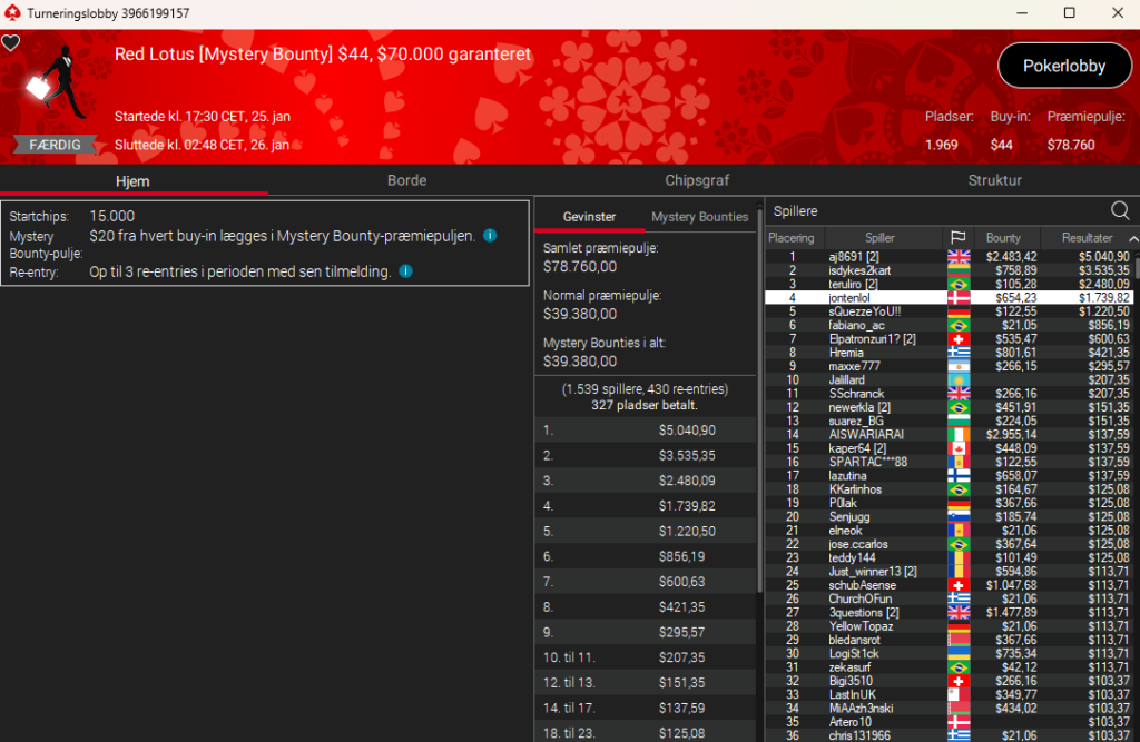 I $44 Red Lotus Mystery Bounty med $70.000 garanteret blev jontenlol nr. 4 til samlet $2.394.