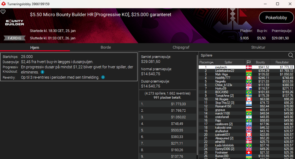 Sørme om der ikke var dansk sejr i $5,50 Micro Bounty Builder HR PKO med $25.000 garantereret til joeybech. Sejren bragte totalt $2.715 til danskeren.