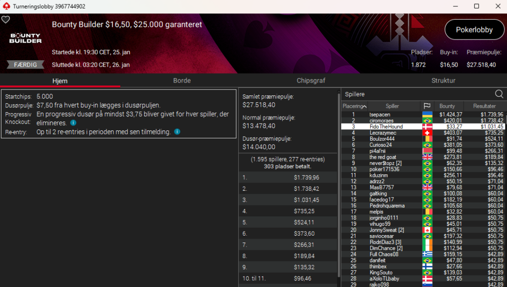 FidoTheHound vandt samlet $1.065 i $16,50 Bounty Builder med $25.000 garanteret.