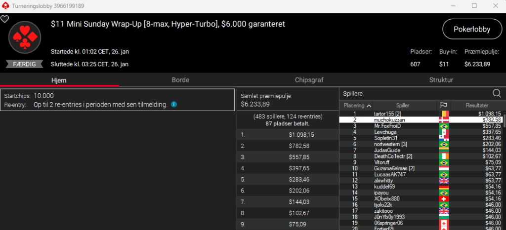 Søndagen sluttede for muchokuzzan med en 2. plads i $11 Mini Sunday Wrap-Up Hyperturbo med $6.000 garanteret til $783.