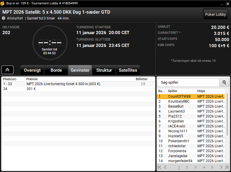 Sidste søndag blev der slået en lille rekord i antal entries i kvallen til årets MPT på Casino Munkebjerg med 200 stk. I går blev den rekord slået, idet der var 202 entries. Det betød, at der var 33 MPT-tickets (værdi 4.500 kr.) i spil.
