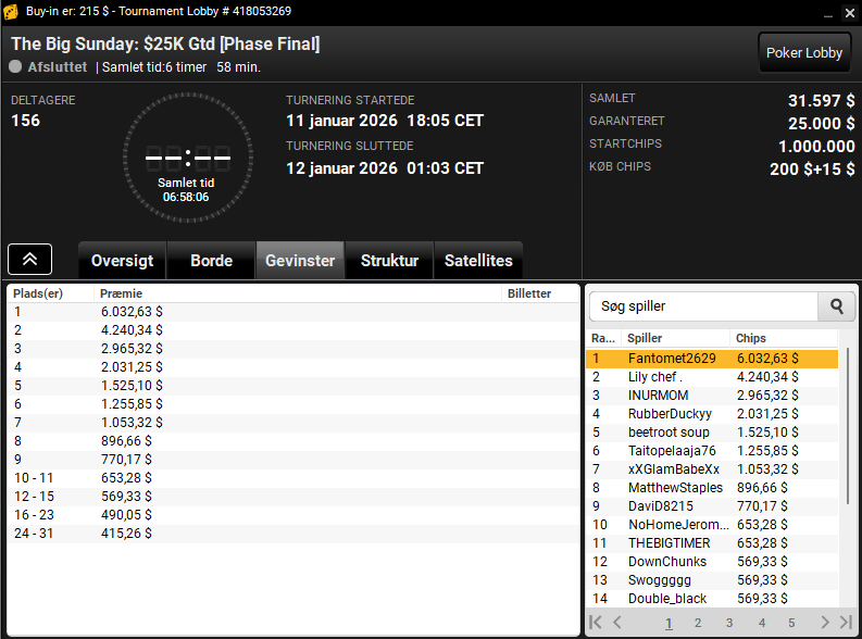 Det var også på Danske Spil Poker, at vi spottede Fantomet2629 første gang. Danskeren vinder nemlig en af de største turneringer på en søndag: $215 The Big Sunday Phase Final med $25.000 garanteret. Sejren gav Fantomet2629 hele $6.033. Tillykke herfra.