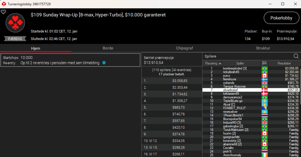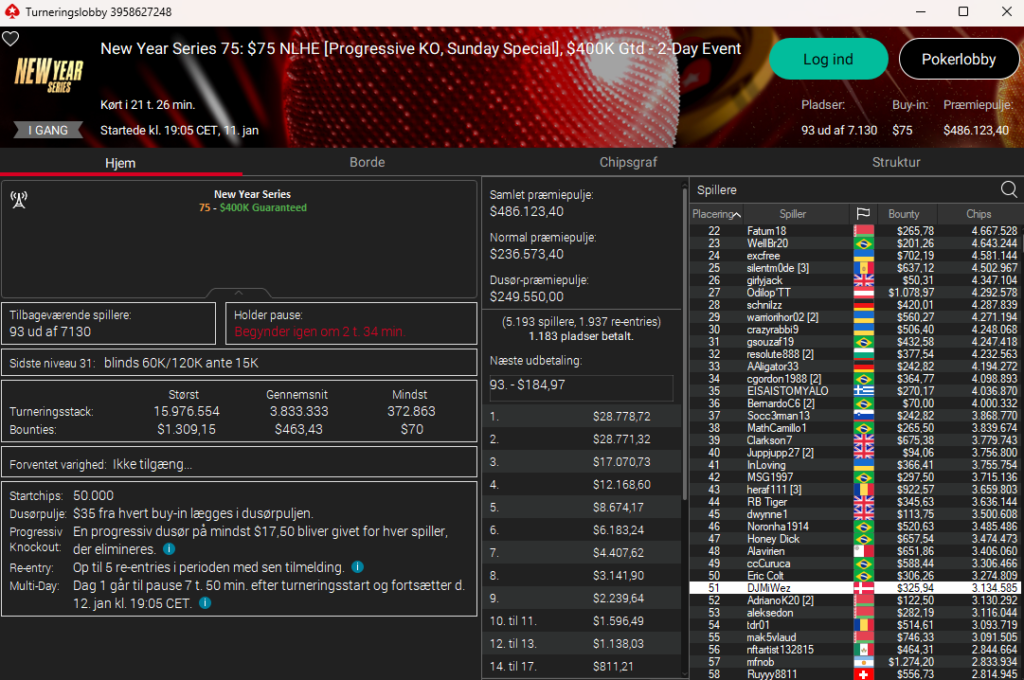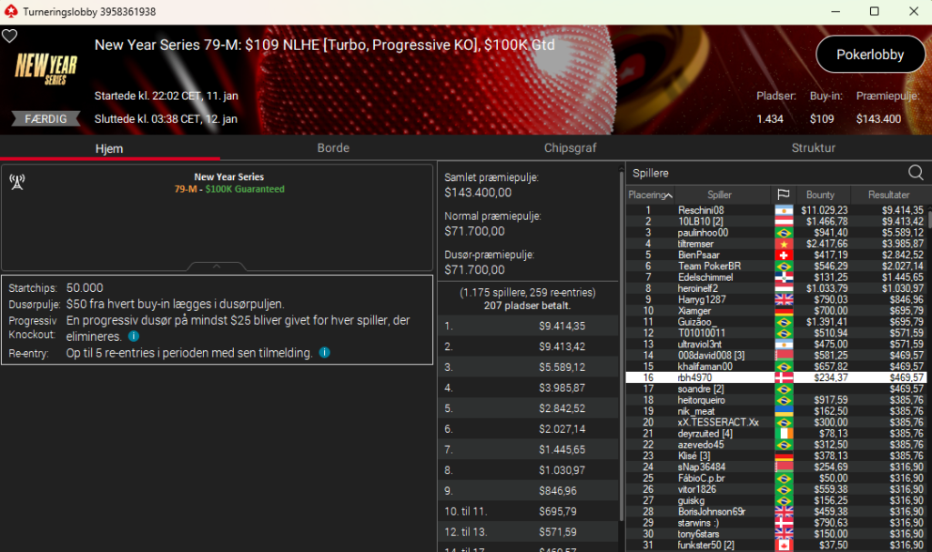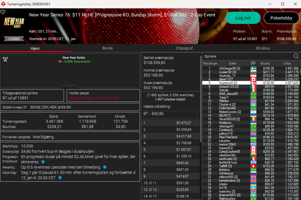 I New Year Series: $11 Sunday Storm NLH PKO med $100.000 garanteret ligger Supernut8 som bedste dansker på en 5. plads ud af de resterende 97 spillere. På en 57. plads ligger serotonine91 – så to danske skud i bøssen: