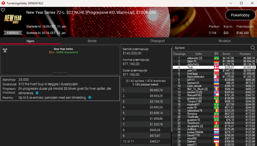 Det blev til en flot 4. plads og samlet $3.887 til danske Tkdk i New Year Series: $22 NLH PKO Warmup med $100.000 garanteret.