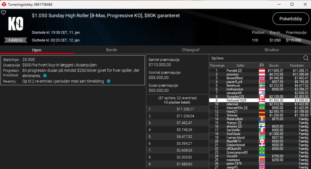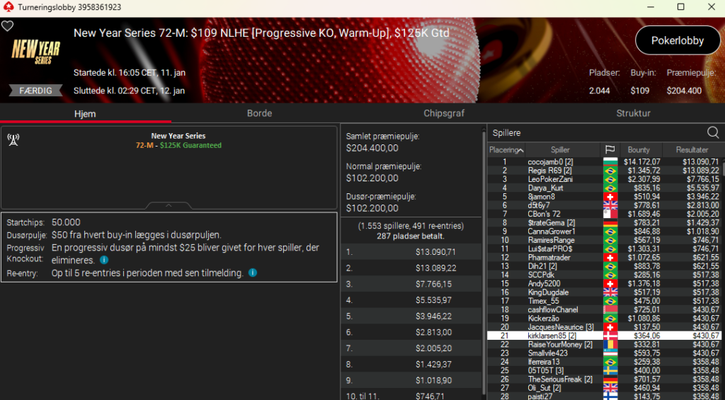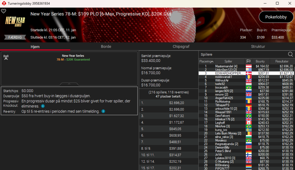 Jannick “EDWARDHOPPER” Wrang blev nr. 3 i New Year Series: $109 PLO 6-Max PKO med $20.000 garanteret. Samlet endte præmien på $1.835 til Jannick.