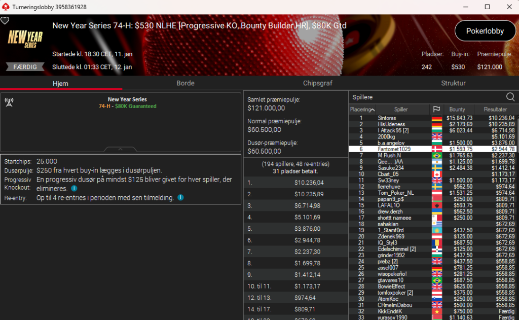 I New Year Series: $530 NLH PKO Bounty Builder HR med $80.000 garanteret blev Fantomet1029 nr. 6 til samlet $4.539.