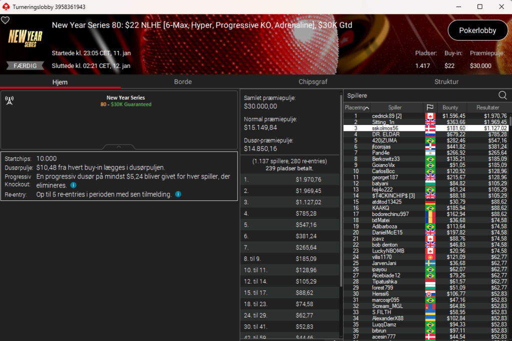 Der var en flot 3. plads til sskolmos56 i New Year Series: $22 NLH 6-Max Hyper PKO Adrealine med $30.000 garanteret. Samlet vinder danskeren $1.309.