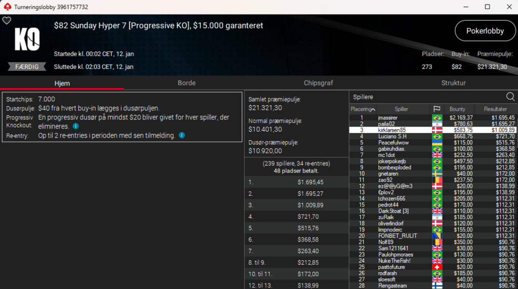 Det er en varm ip-adresse hjemme hos kirklarsen85 i øjeblikket. Lørdag blev det til en andenplads i en New Year Series $530 turnering til $9.090. Udover mange andre flotte resultater søndag, så blev danskeren nr. 3 i $82 Sunday Hyper 7 PKO med $15.000 garanteret. Præmien i hyperen endte på totalt $1.593.