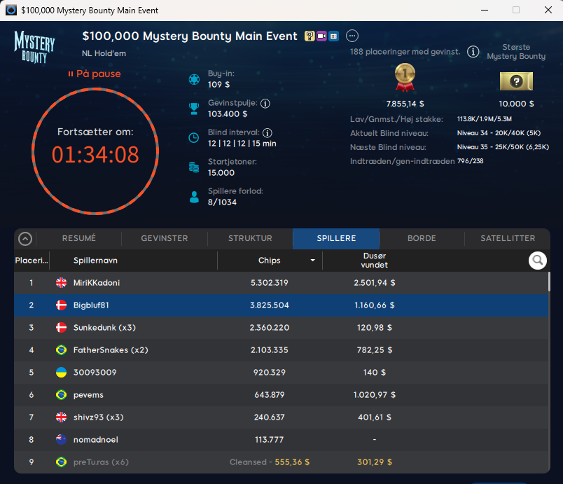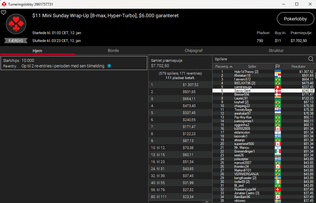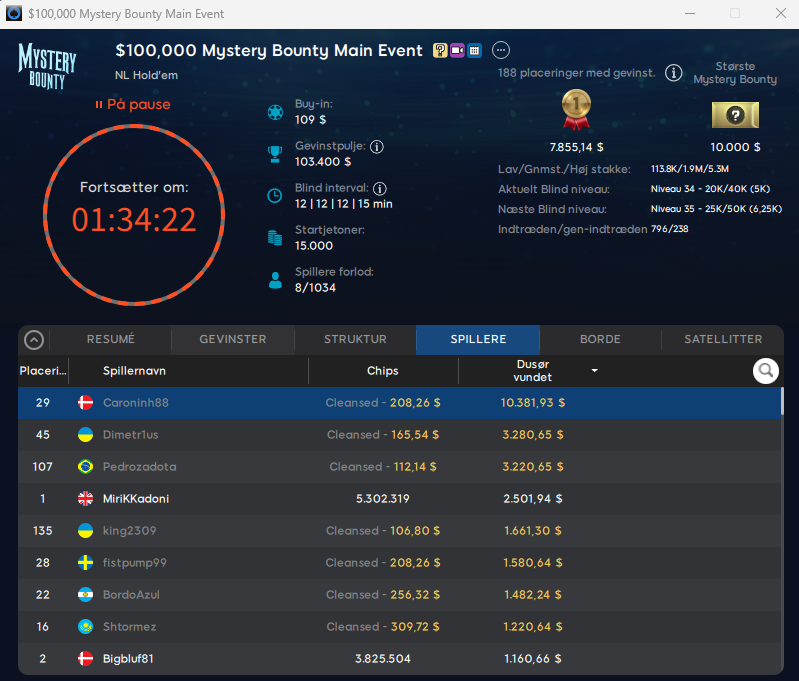 Først kan vi da lige nævne, at den allerstørste bounty i søndagsflagskibet $109 Mystery Bounty Main Event selvfølgelig gik til en dansker. $10.000 er helt vanvittigt at trække, men det gjorde Caroninh88 i går. Stort tillykke herfra. Samlet blev det til en 29. plads og totalt $10.590.