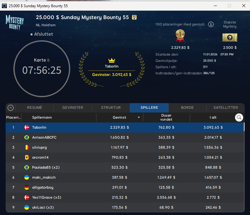 Taborlin vinder samlet $3.093 i $55 Sunday Mystery Bounty med $25.000 garanteret. Tillykke tillykke.