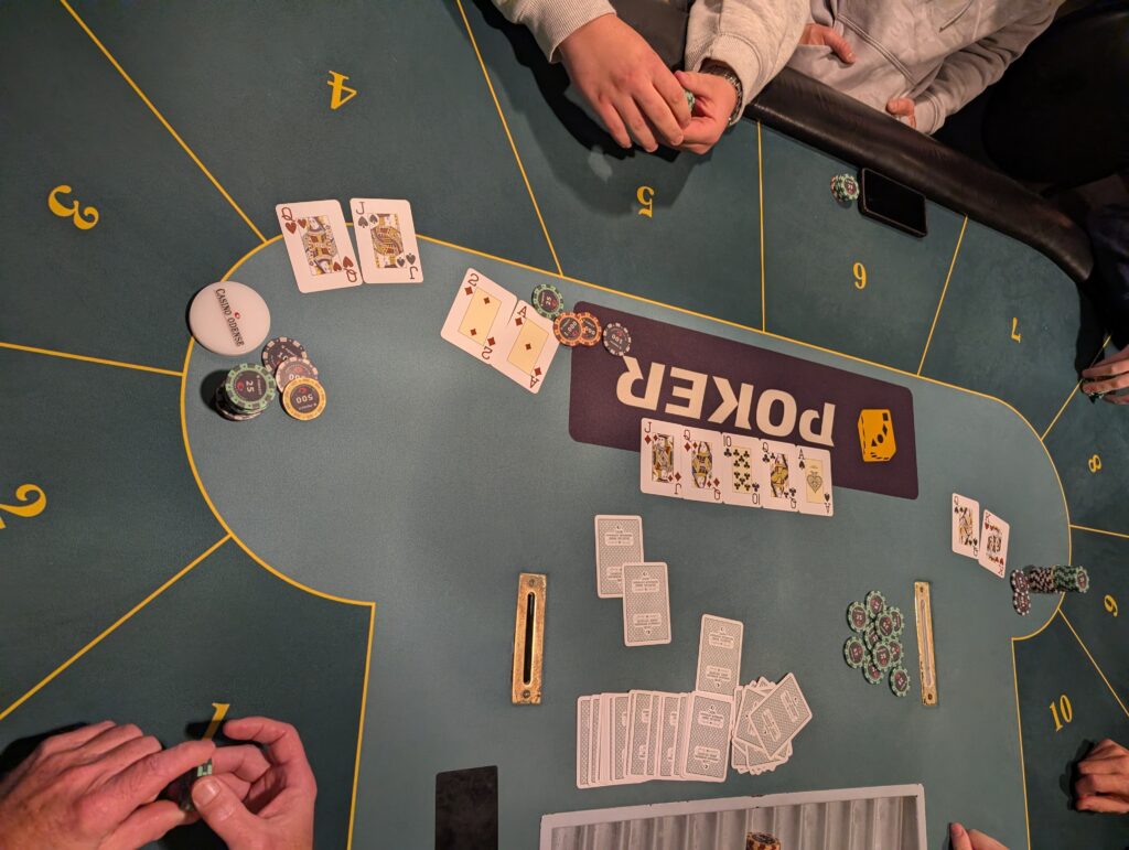 På bord 3 blev der lavet 18 rebuys alene, og der var flere store hænder undervejs. I én af hænderne endte tre spillere all-in med tre middelmådige starthænder – det var jo i rebuyperioden. QJ, A2s og KQ ramte alle floppet, og Jesper Gertz trak potten med QJ.