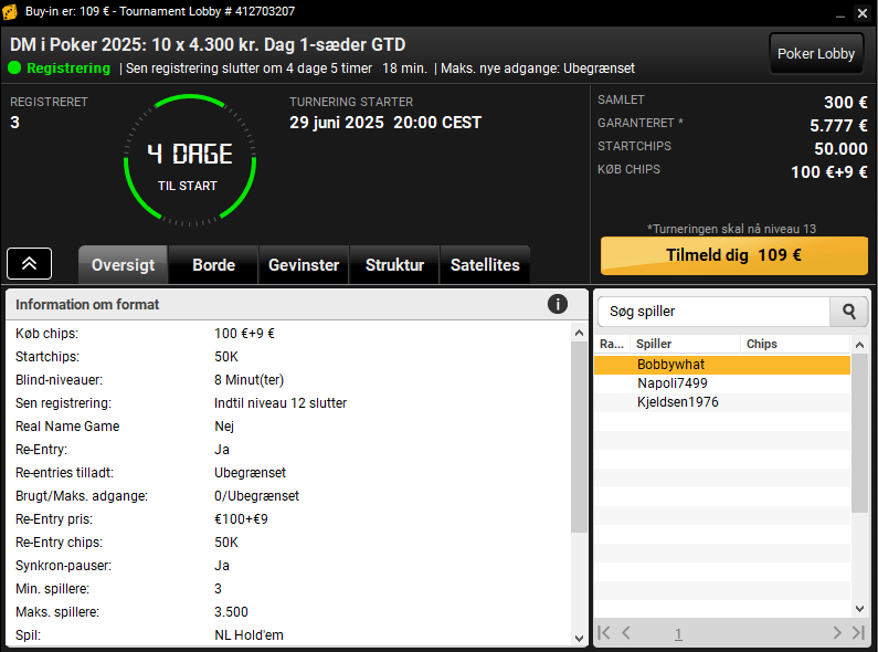 Foto: Danske Spil Poker – lobby til en €109 kvalifikationssatellit